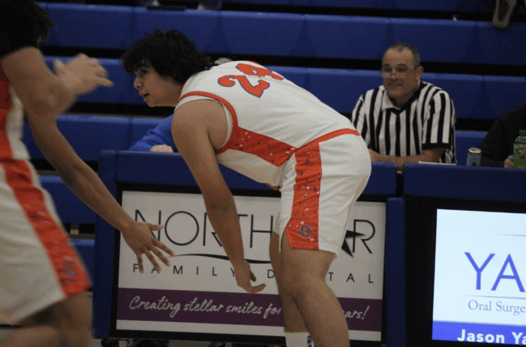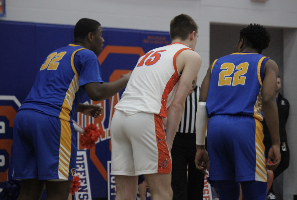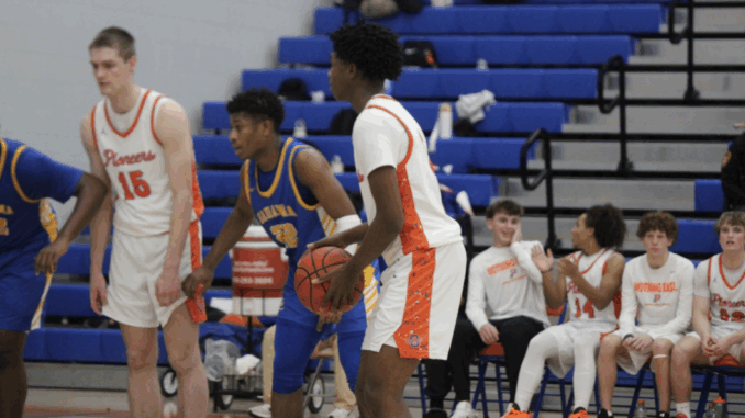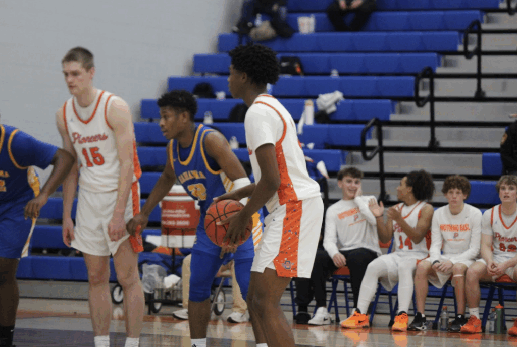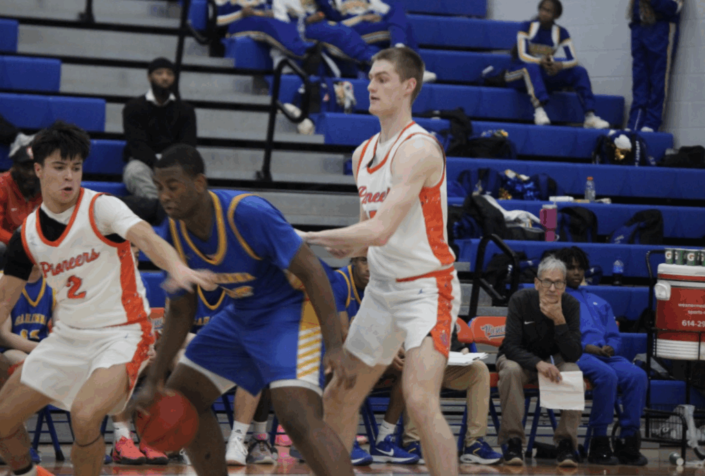 Senior Treyton Shroeder and Junior Grant Miller double team the point guard.